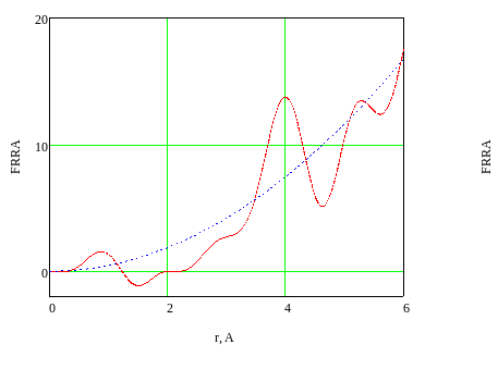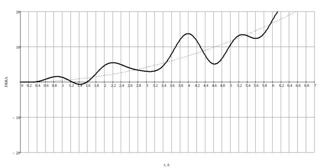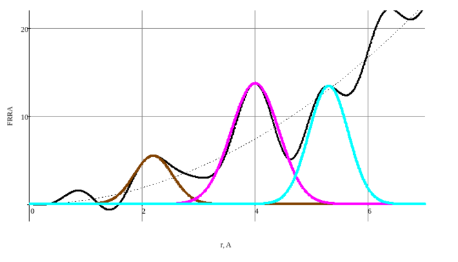 Имея все параметры первого пика ФРРА на участке от r1 до r3, из экспериментальной кривой вычитаем первый пик. Полученная после этой операции функция “открывает” левый фронт второго пика экспериментальной ФРРА. Далее, все операции производятся аналогично для нахождения параметров второй и третьей координационной сферы.