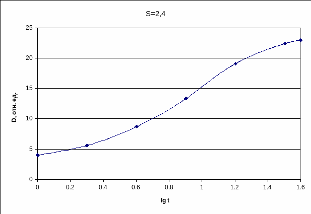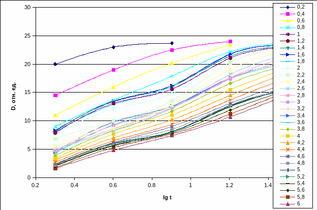 Для использования этого соотношения построим кривые почернения в зависимости от времени экспозиции в полулогарифмическом масштабе по времени (при постоянном S) (см. рис.2).