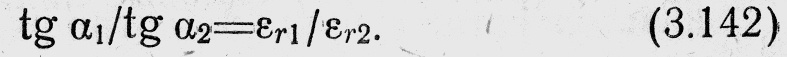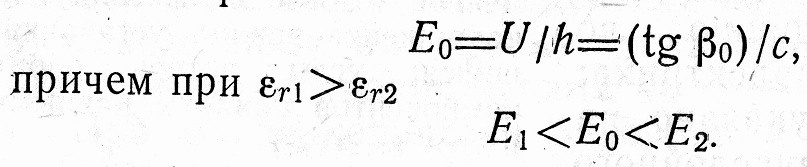 В соответствии с тем, что направления силовых линий электрического поля и линий индукции совпадают, но плотность линий индукции при переходе из одной среды в другую не изменяется, а плотность силовых линий изменяется [см. (3.137)], при расчете электроизоляционных конструкций в случае перехода силовых линий (или линий индукции) из одного диэлектрика в другой под углом к поверхности раздела имеем (рис. 3.48):