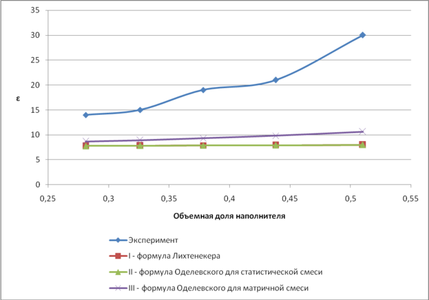 III. Расчет диэлектрической проницаемости композита по формуле Оделевского для матричной смеси.