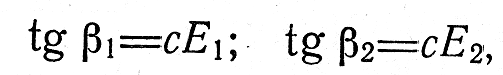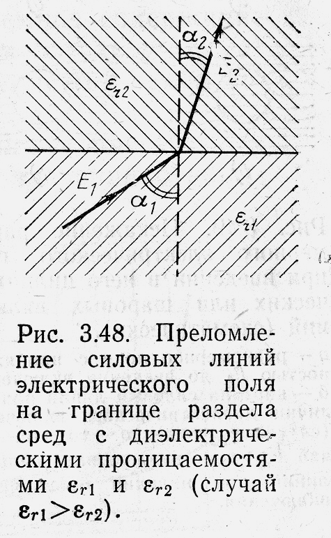 В соответствии с тем, что направления силовых линий электрического поля и линий индукции совпадают, но плотность линий индукции при переходе из одной среды в другую не изменяется, а плотность силовых линий изменяется [см. (3.137)], при расчете электроизоляционных конструкций в случае перехода силовых линий (или линий индукции) из одного диэлектрика в другой под углом к поверхности раздела имеем (рис. 3.48):