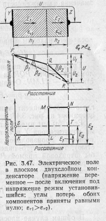 Рассчитаем значения напряженности поля в слоях двухслойного плоского конденсатора. Обозначив h1 и h2 — толщины слоев и U1 и U2 — напряжения на них (см. рис. 3.47), получим при последовательном соединении слоев: