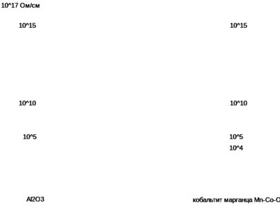 В термочувствительном кабеле электродами являются центральная жила, диаметром 1,5-2 мм и коаксиальная ей оболочка, а между ними находится терморезистивный полупроводниковый слой (толщиной около 2 мм). Технология изготовления кабеля предусматривает изготовление заготовки из трубки (из высоконикелевой марки стали) с коаксиально расположенной внутри нее жилой из той же стали; пространство между внутренней поверхностью трубки и жилы заполняется (набивается) порошком терморезистивного материала. Заготовка подвергается протяжке через фильеры с последовательно уменьшающимся диаметром протяжки (волочения) в несколько приемов. После каждого приема протяжки заготовка отжигается для снятия наклепок. Это происходит при примерно 1100 градусов Цельсия. После протяжки до окончательных размеров на концы кабеля производится пайка герметизирующих вводов, пайка припоем типа ПСР-72 производится в водороде при температуре 900 градусов Цельсия. Для разработки линейно протяженного терморезистора на температуру срабатывания 500-600 градусов Цельсия была выбрана композиция кобальтита марганца. При температуре срабатывания материал ТР должен иметь примерно 10^4 Ом/см. Кобальтиты марганца при комнатной температуре имеют =10^3-10^5 Ом/см. Их электропроводность связана с наличием в них ионов различной валентности одного и того же металла, находящихся в эквивалентных местах кристаллической решетки. Марганцевые полупроводники отличаются тем, что количество разновалентных ионов марганца и кобальта в первую очередь определяется составом (рецептурой) материала и режимом обжига. Она мало изменяется после повторных термообработок на воздухе при температурах 800 градусов Цельсия. Из всех оксидов переходных металлов кобальтиты марганца самые стабильные. График 1.