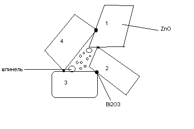 содержат кристаллитны ZnO размером 10-20 мкм, кристаллиты шпинели - размер несколько микрон, третья висмут-содержащая фаза. Висмут-содержащая фаза заполняет некоторое межкристаллитное пространство толщиной менее см, и образуют трехмерный каркас с аморфной структурой. Нужно подчеркнуть, что такая пространственная структура не является достаточно развитой (не охватывает всю структуру) и такая аморфная пленка между кристаллитами встречается достаточно редко. В основном висмут-оксидная фаза локализуется в виде обособленной массы в местах стыка нескольких (3-4) зерен ZnO. Большинство поверхностей раздела ZnO свободны от инородных фаз. Толщина межкристаллической границы зависит от взаимной ориентации блоков в соседних кристаллах. Следует ожидать, что срастание соседних зерен происходит, если направления преимущественного роста блоков почти совпадают. Наиболее толстые границы, наоборот, возникают когда оси С блоков, контактирующие в зернах, ориентированы под большими углами друг к другу. Интересно представляется исследование вида ВАХ от степени разориентации кристаллитов, тем более, что в оксидноцинковой керамике всегда можно получить керамику с достаточно большим размером кристаллитов. Это важно в методе исследования ВАХ единичной межкристаллитной границы.