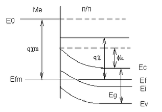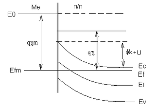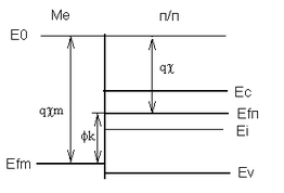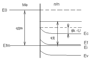 Приведем металл и полупроводник в контакт друг с другом, так чтобы через контакт мог протекать электрический ток. Если просто прижать друг к другу кусок металла и кусок полупроводника, то тесное соприкосновение происходит не по всей поверхности, а в отдельных ее точках. Однако, например, при напылении металла на полупроводник в вакууме или при пайке контакт обеспечивается практически по всей поверхности.