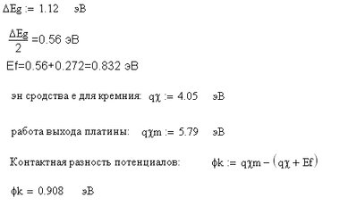 ассчитаем расстояния от уровня Ферми до середины запрещенной зоны и контактную разность потенциалов, которая в данном случае равна полученной величине.