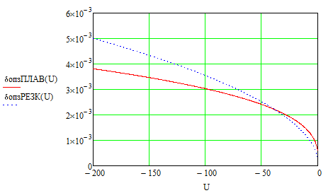 Как видно из графика, напряжение, при котором зависимость ширины ОПЗ для плавного перехода переходит в зависимость для резкого перехода, составляет -38,382009 В. При этом сама ширина ОПЗ равна 2,210597*10-3 см.