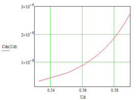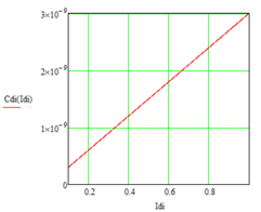 Проведем расчет диффузионной емкости при 300 К. Т.к. в этой формуле стоит ток прямой ветви ВАХ, зная его, можем также определить соответствующие значения напряжения.
