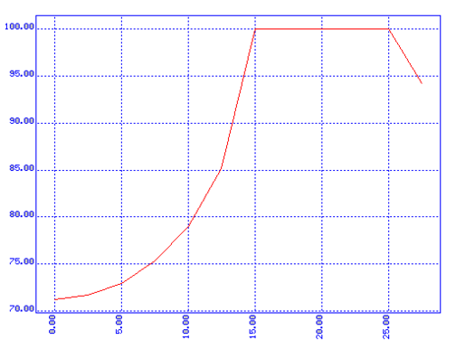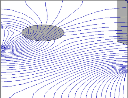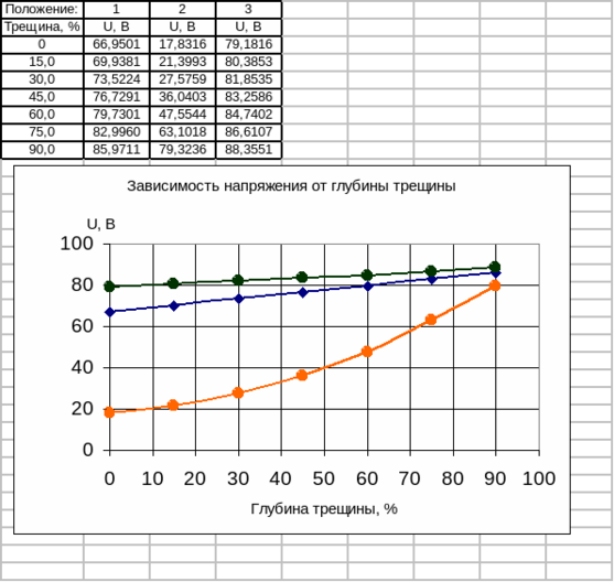 Для фиксированного положения токового электрода и глубины трещины (50% от максимально возможной) снять зависимость показаний вольтметра от координаты точки измерения потенциала на верхней границе области. Повторить при отсутствии трещины.
