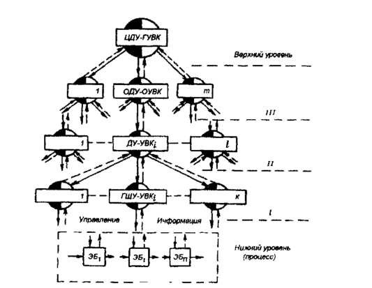 Задачу минимизации затрат можно решать, либо управляя всеми предприятиями, входящими в ОЕС, непосредственно из одного центра — объединенного диспетчерского управления (ОДУ), либо на основе многоступенчатого управления, структура которого показана на. Обычно каждая ОС имеет собственный центр — диспетчерское управление (ДУ), оснащенное комплексом из двух или тpex электронно-вычислительных машин (УВК).