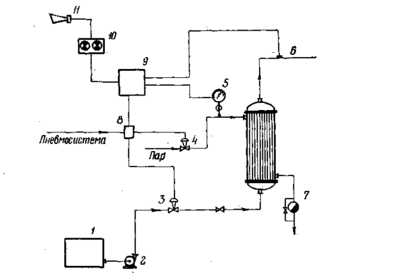 1—сборник раствора, 2 — насос, 3 - регулирующий клапан подачи раствора, 4 — регулирующий вентиль подачи пара, 5 — электроконтактный манометр, б — датчик температуры, 7 — конденсатоотводчик, 8 — пневматический регулятор, 9 — усилитель-преобразователь, 10 — световая сигнализация, 11— звуковая сигнализация