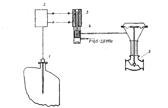 Рис. 8. Блок-схема с золотниковым устройством: / — индикатор темггературы, 2 — вторичный прибор, 3 — электромагнитный привод, - 4 — золотниковое устройство, 5 — мембранный вентиль пневматического действия