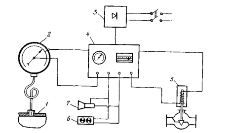Рис. 10.2. Электрическая блок-схема с контактным датчиком: 1 — сосуд, 2 — манометр ЭКМ, 3 — питающее, устройство, 4 — усилитель-преобразователь, 5 — электромагнитный клапан, 6 — световое табло, 7 — сирена