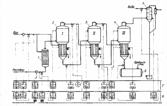 На рис. 11.2 изображена схема трехкорпусной выпарной станции с прямоточным движением раствора. Схема включает приборы автоматического управления и противоаварийной защиты. Панель греющего пара имеет регуляторы давления, обеспечивающие постоянство режима испарения в первом аппарате. Панель имеет предохранительный клапан и необходимую запорную арматуру.
