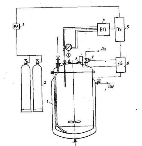 1 — реакционный аппарат, 2 — баллоны с дефлегмирующим веществом, 3 — разрядное устройство, 4 — вторичный прибор для усиления импульса, 5 — пульт управления, 6 — устройство для автоматического включения блокирующих клапанов, 7 — пневматический клапан подачи газа, 8 — взрывная мембрана