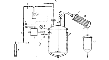Для продувки аппарата перед загрузкой « создания защитной «подушки» над кубовым остатком в процессе разгрузки аппарата применяют гидрозатвор 6, через который подают углекислоту из баллонов с помощью редуктора 5.