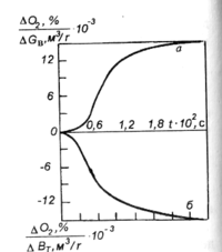 а — при возмущении расходом воздуха (τ — 45 с, Т = 60с); б — при возмущении расходом топлива (газа) (τ= 25 с, Т = 55 с)