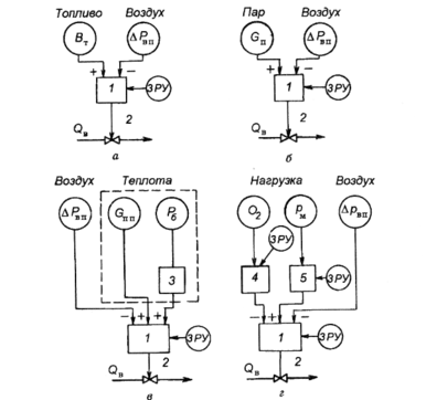 ч — топливо — воздух; б — пар — воздух; в — теплота — воздух; г — нагрузка — воздух с коррекцией по О2; 1 — регулятор подачи воздуха; 2 — регулирующий орган; 3 — дифференциатор; 4 — корректирующий регулятор воздуха; 5 — корректирующий регулятор давления перегретого пара (регулятор задания по нагрузке)