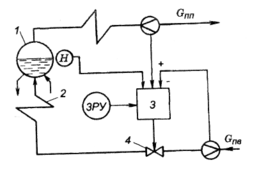 Схема автоматического регулирования. Исходя из требований к регулированию уровня воды в барабане, автоматический регулятор должен обеспечить постоянство среднего уровня независимо от нагрузки котла и других возмущающих воздействий. В переходных режимах изменение уровня происходит довольно быстро, поэтому регулятор питания для обеспечения малых отклонений уровня должен поддерживать постоянство соотношения расходов питательной воды и пара. Эту задачу выполняет трехим-пульсный регулятор, принципиальная схема которого изображена на рис. 12.8. Регулятор 3 перемещает клапан 4 при появлении сигнала небаланса между расходами питательной воды Gn B и пара Сп п.