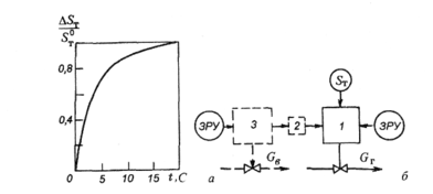 Кривая изменения сигнала по разрежению верхней части топки ST, при возмущении расходом топочных газов приведена на рис. 12.6, а. Участок по разрежению не имеет запаздывания, обладает малой инерционностью и значительным самовыравниванием. Отрицательным свойством участка служат колебания регулируемой величины около среднего значения ST, с амплитудой до 30—50 Па (3—5 мм вод. ст.) и частотой до нескольких герц.