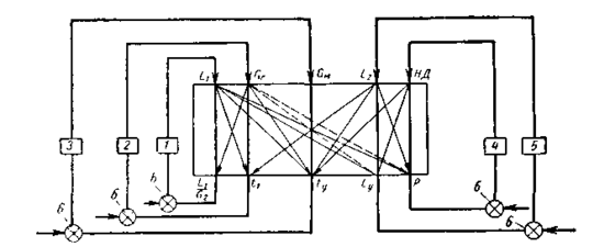 Установка является объектом с взаимосвязанными параметрами (рис. 16.4). Учитывая степени связи между отдельными параметрами и используя методы теории автоматического управления, необходимо в каждом конкретном случае решать вопрос об