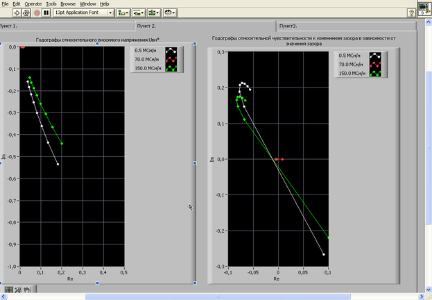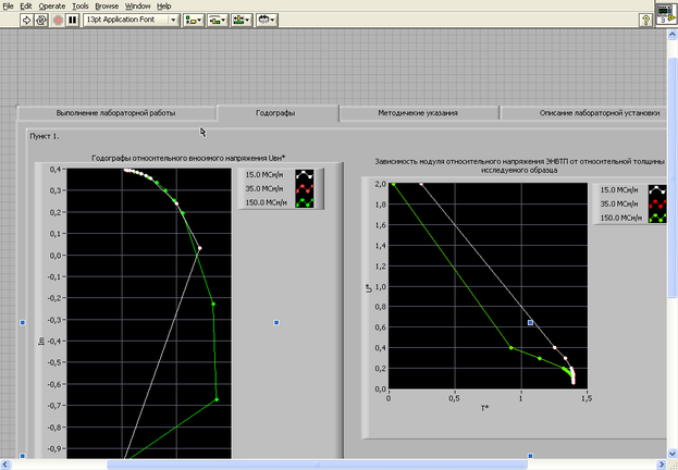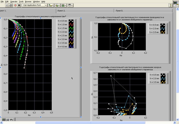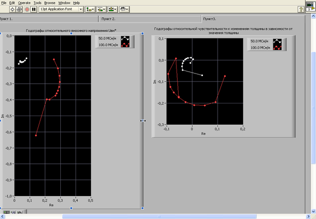 Для серии образцов различной толщины, выполненных из одного материала, снять и построить годографы относительного вносимого напряжения от толщины. Значение зазора выбрать h = 0.5 мм.