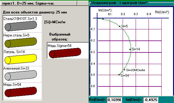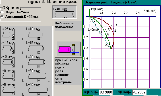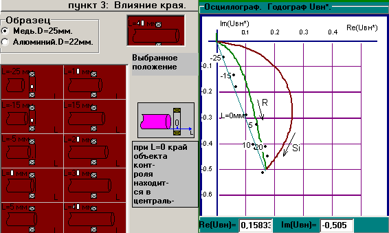 3. Для двух образцов – медного (D=25 мм, s=54 MCм/м) и алюминиевого (D=22 мм, s=33 MCм/м) провести измерения при различном расстоянии края образца от измерительной катушки. По полученным точкам построить годографы влияния края.