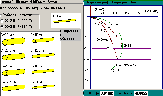 1. Установить значение рабочей частоты, соответствующей значению обобщённого параметра х=2,5 для латунного цилиндра с D=25 мм и s=14 MCм/м. Провести измерения с пятью цилиндрическими образцами диаметра 25 мм, с разными проводимостями (1,3; 5; 14; 33; 54 МСм/м) и получить на комплексной плоскости Uвн* точки, соответствующие различным значениям s. По полученным точкам построить годограф Uвн*=f(s).