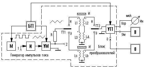 Все приборы и блоки соединены между собой в соответствии с изображенной функциональной схемой. Импульсы тока с частотой 200, 500, или 1000 Гц поступают от генератора на обмотки возбуждения двух накладных или экранных преобразователей, размещенных с усилителем-преобразователем Уп в блоке преобразователей. Усилитель-преобразователь создает два постоянных выходных усиленных напряжения : Uм - прямо пропорциональное максимальному значению импульсов напряжения на входе усилителя и Uср - среднему значению. Напряжение Uм измеряется вольтметром В, а Uср - микроамперметром Ин. Обмотки возбуждения L1 , и L3 накладных преобразователей соединены последовательно согласно , а измерительные обмотки L2 и L4 - последовательно встречно.