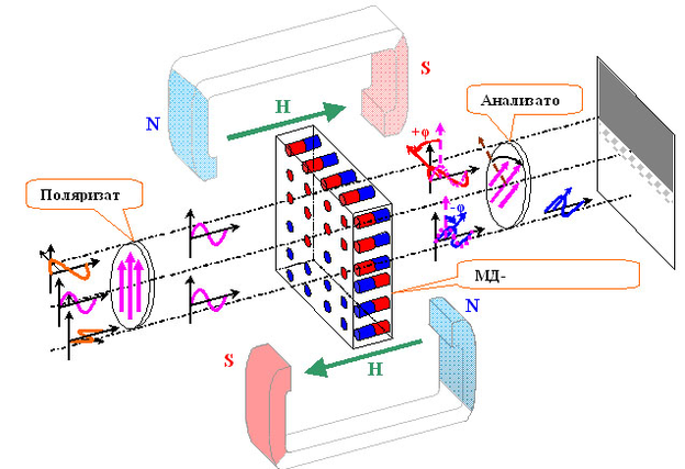Принцип действия: От источника света освещается пленка, между пленкой и источником ставят поляризатор и свет получается определенной поляризации. Помещаем П магниты так, чтобы половина пленки вправо, другая влево. При прохождении света 1 половины поляризация меняет угол на 20-30*, а другая половина на тот же угол, но в другую сторону. Между ними угол 40* где то (например). Далее стоит анализатор – чтоб поляризация прохождения света совпадала.