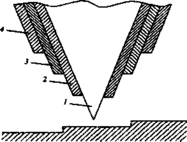 1 - острие; 2-4 напыленные гетерослои, образующие лазер, фотоприемник, термопару и т.д.