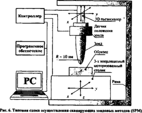Ключевая идея зондовой микроскопии относительно проста. Общим у всех этих методов является наличие зонда и сканирующего механизма, способного перемещать его над поверхностью образца в трех измерениях. В качестве зонда чаще всего используется заостренная игла с радиусом при вершине, равным 10 нм.