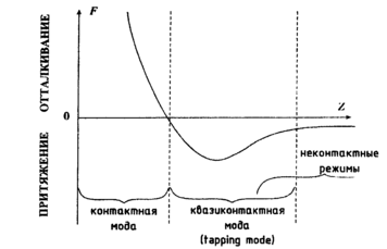 При этом методе регистрируют вариации силы взаимодействия кончика иглы с исследуемой поверхностью от точки к точке . Игла расположена на конце консольной балочки (кантилевера) с известной жесткостью, способной изгибаться пол действием небольших Ван дер Ваальсовых сил, возникающих между исследуемой поверхностью и вершиной острия. Деформацию кантилевера регистрируют по отклонению лазерного луча, падающего на его тыльную поверхность, или с помощью пьезорезистивного эффекта, возникающего в самом кантилевере при изгибе.