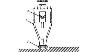 1-волновод, сужающийся к нижнему концу; 2 - фотоприемник; 3 - световое поле открытого конца волновода с диаметром меньше длины волны света
