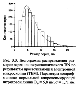 Гистограмму распределения размеров зерен нанокристаллического образца можно получить из результатов просвечивающей электронной микроскопии(TEM). Огибающая такую гистограмму линия обычно аппроксимируется логарифмически-нормальной кривой.