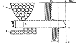 1-зонд; 2- образец; It - туннельный ток в зазоре δ; Еf - уровень Ферми; U - напряжение, приложенное к зазору (0,01-10 В); W - энергия; e - заряд электрона; Z - ось, перпендикулярная к поверхности образца
