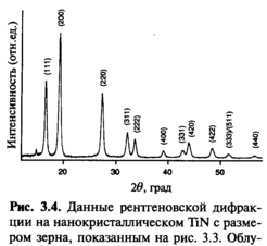 Размер зерен можно также определить из результатов рентгеновского дифракционного сканирования. Ширина брэгговских пиков на угловой зависимости амплитуды(зависимость интенсивности в отн.ед. ат от 2θ в градусах) содержит информацию о среднем размере зерна в образце TiN.