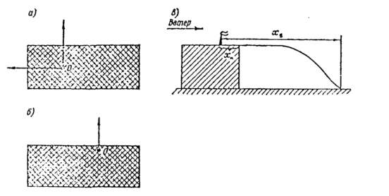 1. В отдельных случаях опасное направление ветра может быть установлено до проведения расчетов. Так, например, если источник располагается у более длинного края крыши, то опасным является направление ветра по нормали к ближайшей стене здания в сторону подветренной тени (см. рис. 13 б).