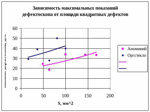 При увеличении площади квадратного дефекта наблюдается увеличение амплитуды сигнала, причем для органического стекла получаем большую чувствительность, чем для алюминия. Нелинейность характеристик можно объяснить неоптимальной настройкой дефектоскопа.