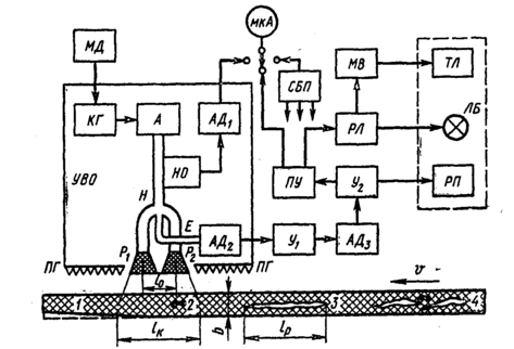 КГ – клистронный генератор, МД – модулятор, А – аттенюатор, НО – направленный ответвитель, Н, Е – СВЧ-мост, Р1, Р2 – рупоры, ПГ – поглотитель, АД1, АД2, АД3 – детекторные секции (амплитудные детекторы), мкА – микроамперметр для индикации уровня мощности, У1, У2 – усилители, РП – регистрирующий прибор, ПУ – пороговое устройство, РЛ – электромагнитное реле, ЛБ – лампа “Брак”, МВ – мультивибратор, ТЛ – телефон, 1 – бездефектный участок, 2 – точечный дефект, 3 – протяженный дефект, 4 – дефект сложной формы, V – скорость равномерного поступательного движения контролируемого объекта.