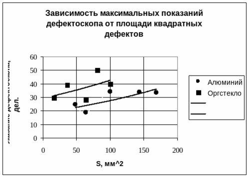 Зависимость показаний индикатора дефектоскопа от площади для дефектов из алюминия в виде прямоугольника позволяет сделать вывод о том, что при Lφ > Lr амплитуда сигнала уменьшается.