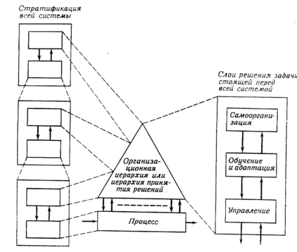 Элемент верхнего уровня имеет дело с более крупными подсистемами или с более широкими аспектами поведения системы в целом. При многоэшелонной иерархии элемент верхнего уровня является «командным» по отношению к двум или более элементам, и принимаемое им решение координирует их действия в соответствии с целью, определенной для совокупности всех подчиненных ему элементов. Для концепции слоев это следует из ответственности элементов верхнего уровня за поведение системы в течение более длительных промежутков времени. Чтобы собрать информацию, необходимую для сужения множества неопределенностей, слой обучения должен проводить наблюдения в течение ряда периодов принятия решения на первом слое. Чтобы изменить структуру стратегии принятия решений, третий слой (слой самоорганизации) должен наблюдать за действиями нижележащих слоев в течение еще большего периода времени, так как для оценки качества стратегии обучения ее следует испытывать, по крайней мере, несколько раз. Аналогично и для концепции страт: система на любом уровне образуется из подсистем нижних уровней, и, следовательно, более высокая страта имеет дело с более общим аспектом поведения всей системы.