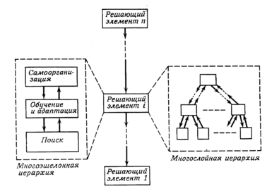 Описания и проблемы на верхних уровнях менее структурированы, содержат больше неопределенностей и более трудны для количественной формализации. Проблема принятия решений на верхних уровнях может рассматриваться как более сложная. Конечно, для решения задачи на верхнем уровне могут использоваться приближенные методы, но тогда точность понижается, и следует соблюдать осторожность при интерпретации результатов. В общем случае для любого уровня существует специфический набор средств для решения соответствующих задач. Например, в многослойной иерархии у каждого слоя существует свой собственный набор методов и алгоритмов: на слое выбора - это управление с обратной связью и численные методы оптимизации; на слое адаптации преобладают статистические методы или методы распознавания образов; на слое самоорганизации используются эвристические методы. Задачи верхнего слоя не удается поставить так, чтобы они имели простое численное решение. Поэтому на практике обычно прибегают к «вмешательству в критических ситуациях», т.е. оценивают общую характеристику и вносят структурные изменения лишь в случае, когда характеристики ухудшаются до такой степени, что изменение становится необходимым. В общем случае, однако, нет априорной гарантии, что изменение приведет к действительному улучшению характеристики.
