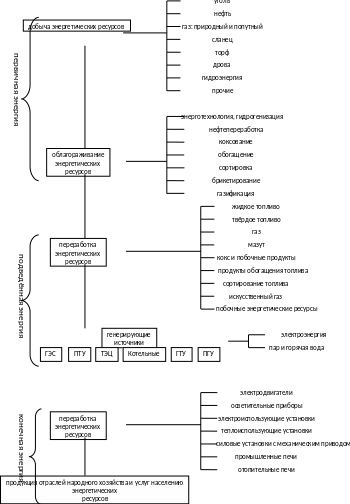 Современное энергетическое хозяйство национальной экономики включает в себя всю совокупность предприятий, установок и сооружений, а также связывающих их хозяйственных отношений, которые обеспечивают функционирование и развитие добычи (производства) энергоресурсов и всех процессов их преобразования до конечных установок потребителей включительно. Укрупненная схема основных последовательных процессов преобразования энергетических ресурсов показана на рис. 1.1.