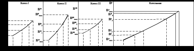 Энергетическая характеристика котельной строится по тем же характерным точкам, что и характеристика относительных приростов расходов топлива (рис.9.10). При этом используются дополнительно энергетические характеристики отдельных котлов.