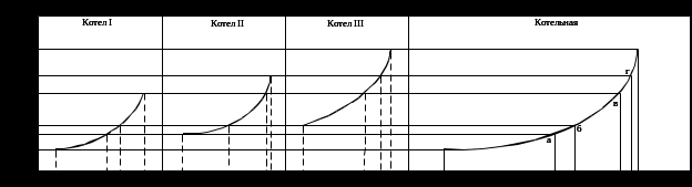 Первый излом характеристики котельной (точка а) вызывается в данном случае началом загрузки котла I. Нагрузка котельной, соответствующая излому характеристики в точке а,