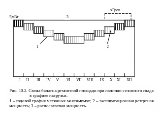 Продолжительность капитальных ремонтов основного оборудования тепловых электростанций весьма значительна, и проводятся они, как правило, весной и летом – в период сезонного спада электрической и тепловой нагрузки потребителей. Кратковременные текущие ремонты оборудования проводятся в дни с пониженной нагрузкой (выходные, праздничные). Однако по мере роста мощности электростанции и укрупнения единичной мощности агрегатов длительность простоя в текущем ремонте возрастает. В связи с этим для обеспечения круглогодичного проведения текущего ремонта в энергообъединениях необходим определенный ремонтный резерв мощности.
