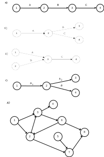 При составлении сетевых графиков, чтобы избежать ошибок, должны соблюдаться определенные правила. Например; если работы A, B, C выполняются последовательно, то на графике это изображается в виде последовательной цепочки работ и событий (рис. 10.5 а), если для выполнения работ B и C необходим результат одной и той же работы A, то на сетевом графике это изображается, как показано на рис. 10.5 б; если работе C должны предшествовать работы A и B, то на сетевом графике это изображается, как показано на рис. 10.5 в; в случае, когда работе B должна предшествовать только часть работы A, последняя разбивается на две работы A1 и A2 (рис. 10.5 г). Не должно быть событий(рис. 10.5 д); за исключением исходного, в которые не входит ни одна стрелка (событие 5); а также событий, за исключением завершающего, из которых не выходит ни одной стрелки (событие 4) не должно быть замкнутых контуров, т.е. путей, соединяющих некоторое событие с ним же самим (контур 2 – 3 – 6 на рис. 10.5 д).