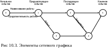 Фиктивная работа (логическая связь, зависимость) служит только для обозначения логических связей между окончанием одних работ и началом других. Зависимость изображается на графике пунктирной стрелкой (рис. 10.3).