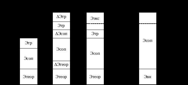 Этеор — теоретический (безусловно полезный) расход энергии; Эсоп— сопутствующий расход энергии (потери в технологическом аппарате); Этр — потери передачи и трансформации энергии — нормативные потери в энергоприемнике технологической установки; Эпол— условно-полезный расход энергии (количество энергии, переданной из энергоприемника в технологический аппарат в нормативном режиме); Эн — нормативный расход энергии в технологической установке;